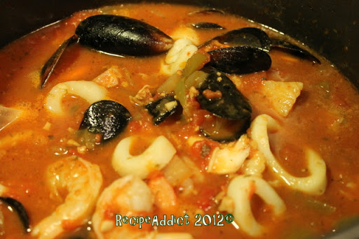 In a separate large saucepan, one that is taller than it is wide, arrange the fish. First, ladle in a thin layer of the sauce. Then arrange the cracked crab in a layer. Begin stacking the fish on top of that in the order of how long they will take to cook: start with the meaty ones, then the flaky, then add the shrimp, then the clams and/or mussels, and lastly the calamari..