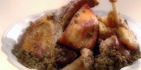4. In the fat remaining in the Dutch oven, soften the onions and garlic over medium heat. Add the lentils and mix well. Deglaze with the wine. Return the chops and sausages to the pot. Add the broth, duck legs and bay leaves. Bring to a boil. Cover, transfer to the oven and bake until the lentils are tender, about 90 minutes. Adjust the seasoning