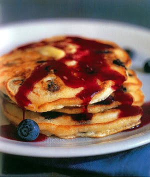 Heat a heavy nonstick skillet or griddle over medium high heat to 375?F. When hot, lightly brush surface with oil. Add about 1/3 cup of batter per pancake to skillet. Sprinkle a few blueberries over each round of pancake batter and cook 2-3 minutes, or until small holes appear in batter and bottom is browned. Turn cakes and cook about 1 minute or until browned.