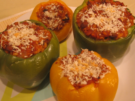 Cut tops off peppers; remove seeds and membranes. Chop edible part of tops and set aside. Rinse peppers under cold water. Place peppers in a large pot; cover with salted water. Bring to a boil; reduce heat, cover, and simmer for 5 minutes. Drain peppers and set aside.