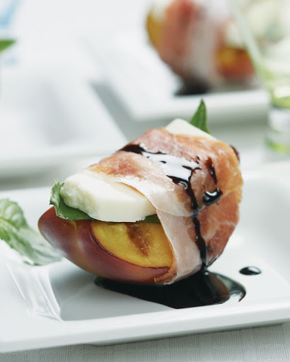 Reduce vinegar to 1/4 c. Grill nectarines cut side down for 5 min; cut in 1/2 again. Wrap in prosciutto with basil and cheese. Drizzle with balsamic.