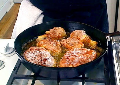 Place chicken skin side down into the pan. Put thighs in the center, and breast and legs around the edge of the pan. The oil should come half way up the pan. Cook chicken until golden brown on each side, approximately 10 to 12 minutes per side. More importantly, the internal temperature should be right around 180 degrees. (Be careful to monitor shortening temperature every few minutes.)