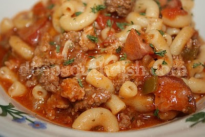Stir in the tomato sauce, diced tomatoes, stewed tomatoes, bay leaves and parsley, and bring to a boil. Reduce heat and simmer uncovered for 15 minutes. Add the beef broth and pasta, bring to a boil, reduce heat, cover and simmer for 20 minutes or until noodles are tender and liquids have reduced. Taste, adjust seasonings as needed, remove and discard bay leaves, and serve with a nice side salad and a green veggie.