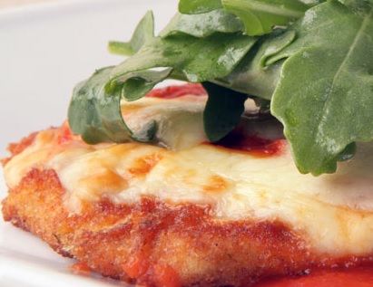 Lay the fried chicken scallopine on a nonstick, oven-safe tray, and top each serving with 2 tablespoons of sauce and 2 ounces of shaved or grated provolone cheese.