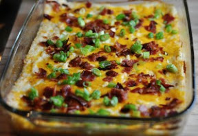 Spray a 9×13-inch baking dish with cooking spray. Place the potatoes into the dish. The casserole may now be covered with plastic wrap and refrigerated until ready to bake. When ready, preheat the oven to 350. Remove plastic wrap and bake for 30 to 35 minutes, until hot. Sprinkle the remaining 1 cup of Cheddar cheese over the top of casserole and return to oven for 5 minutes, until cheese melts. Garnish with chopped chives and crumbled bacon before serving.