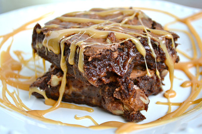 After 10 minutes remove the brownies from the oven. Pour half of the melted caramel over the baked brownie layer and sprinkle with pecans. Drop remaining brownie batter over caramel/pecan layer and carefully swirl with a knife.