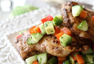3- Add the lime juice to the skillet and bring it to a simmer. Cover the skillet and simmer until the chicken is cooked through, 15-20 min. Serve with the avocado salsa and lime wedges.