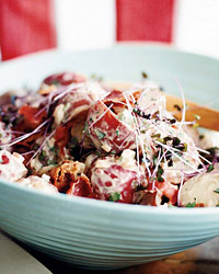 Add the celery, red onion, parsley and tarragon to the potatoes and season with salt and pepper. Let stand for an additional 20 minutes, stirring a few times. Garnish with the bacon and sprouts, then serve.