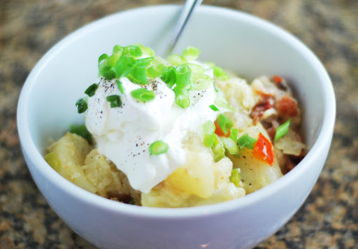 Cook bacon in the oven on a cookie sheet lined with heavy duty foil on 400 for about 15 minutes. Don’t wait on your oven to heat up to 400, just pop in the over right when you turn it on. You will never go back to frying or microwaving. Promise! While bacon cooks, peel and cube potatoes. Cover in water and boil until they are very soft. Stick a fork in and you will know. In a large skillet, heat olive oil and saute onions and bell pepper. Add potatoes and cook for about 5 more minutes. Add about a tsp. of Cajun seasoning. Then add shredded chicken, crumbled bacon and cheese. Cover the skillet with a lid and cook until cheese is melted. Season with salt and pepper and top with plenty of sour cream and green onions. This is now my go-to-meal for my boys when Brian and I have a babysitter. And if you don’t want to mess with the chicken, it would still be great and even easier without it. Don’t skip the bacon though.