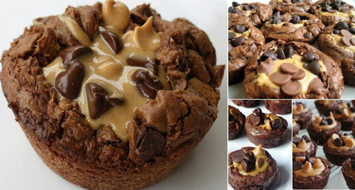 Over low heat, warm creamy peanut butter. While brownies are still warm spoon about half teaspoon warm peanut butter into the center of each brownie; top with chocolate chips and peanut butter chips. Cool completely in pan. Remove from pan and serve.