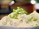 Reserve some scallion greens and capers for garnish. Meanwhile, stir together the mayonnaise, mustard, pickles and their juice, onion, remaining scallions and capers, parsley, and lemon juice in a bowl large enough to hold the potatoes. Peel the cool eggs and grate them into the bowl. Stick a fork into the potatoes and lift them 1 at a time out of the colander. Break up the potatoes by hand into rough chunks, add them to the bowl and toss to coat with the dressing. Season, to taste, with salt and pepper. Drizzle with a little olive oil before serving.