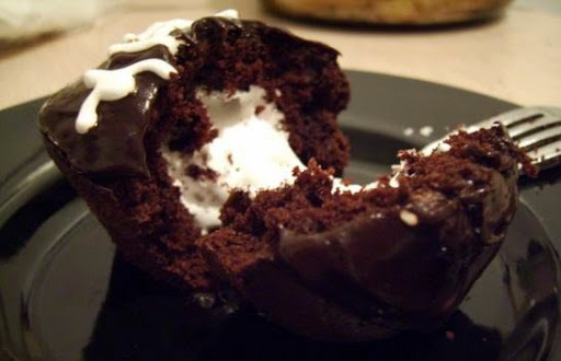In the bottom of each cooled cupcake, insert a pairing knife about 1 1/2 inches, then cut a small circle (1/2 inch or so in diameter), and remove the cake piece. Cut the top half off of the cake piece (this is the plug for the filling). Insert the cut corner into the opening in the cupcake, and squeeze the Fluff into the opening, filling the cupcake. Replace the tiny plug in the cake, and set the cupcake aside. Repeat for all cakes.