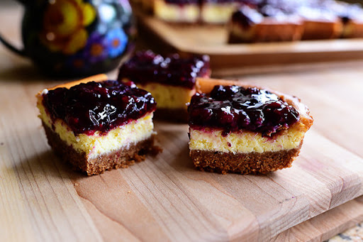 Pour the blackberries over the cheesecake and place the pan into the fridge to chill and set for at least 2 hours. When ready to serve, remove the cheesecake from the pan by lifting the edges of the foil. Peel back the foil and use a long serrated knife to cut cheesecake into squares.