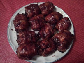 Cut apple into wedges. Lay the thighs out flat. Place an apple slice in the bone cavity and sprinkle brown sugar on slice. Roll up thigh and wrap with a slice of bacon. Put in smoker for 2 hours at 325*-350* for 2 hours. 5 minutes before removing from grill, coat generously with sauce.