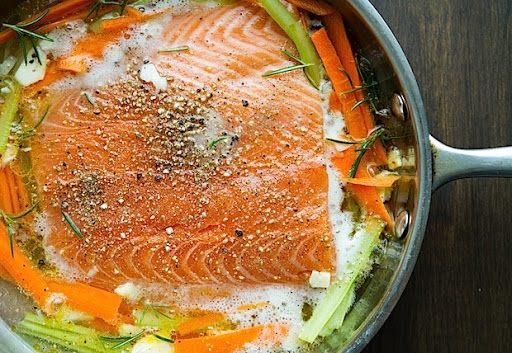 After 5 minutes, remove the cover and stir the vegetables around the pan. Pour more of the sparkling wine into the pan, just enough to cover the salmon. Cover. Keep the pan over the heat and when the sauce is greatly reduced, the salmon is ready; about 10 minutes.