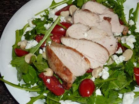 Toss arugula with olive oil, lemon, sea salt and pepper. Plate and top with tomatoes, nuts, cheese, and chicken.