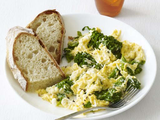 Add the remaining 1 tablespoon olive oil to the skillet. Add the eggs, 1/2 teaspoon salt, and pepper to taste and cook, stirring with a rubber spatula, until the eggs are just barely set, about 3 minutes. Remove from the heat and stir in the broccolini and ricotta. Sprinkle with the parmesan. Serve with bread, if desired.