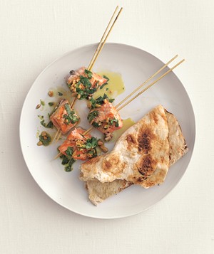 Heat grill to medium-high. Thread the salmon onto skewers and season with ½ teaspoon salt and ¼ teaspoon pepper.