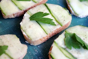 Simple but elegant and tasty tea sandwiches featuring sliced bagette, whipped cream cheese, thinly sliced cucumber and salt and pepper to taste.