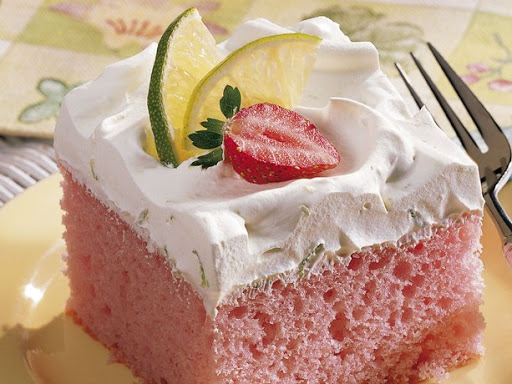 Gently stir lime peel into whipped topping; spread over top of cake. Garnish with strawberries. Store covered in refrigerator.