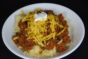 Brown ground beef. Add onion and cook until tender. Add remaining ingredients and simmer for 15 minutes. Serve over crushed tortilla chips.