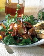 Arrange watercress on six serving plates, top with warm pear mixture, and sprinkle with bacon. Place two croutons with a piece of blue cheese on each plate. Drizzle reduced cider over salad. Serve immediately.