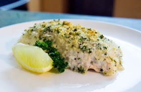 1. In a small bowl combine mayo, cheese, chives, and worcestershire. Spread over fish and place in coated baking dish.