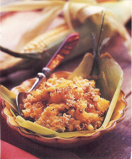 In a small bowl, combine bread crumbs and melted butter. sprinkle over top of polenta mixture. Bake in a 325 degree oven about 50 minutes or until knife inserted near the center comes out clean.