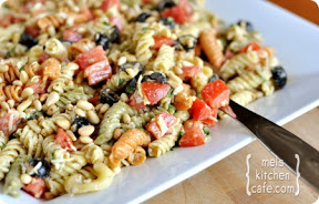 Cook pasta and coat with Caesar dressing while warm. Add the rest of the ingredients (minus the pine nuts) and toss. Top with toasted pine nuts. Refrigerate until ready to serve.