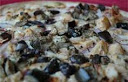 Spread pesto sauce over pizza crust. Top with tomato slices, chicken, artichokes and olives.
