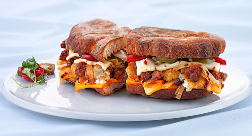 For each sandwich, layer bottom slice of bread, in this order, with 3 slices Pepper Jack, half chorizo-onion mixture, half the potato puffs, 3 American Cheese slices and pickled jalapeños, if using. Finish with remaining American Cheese slices and top with remaining bread slices.