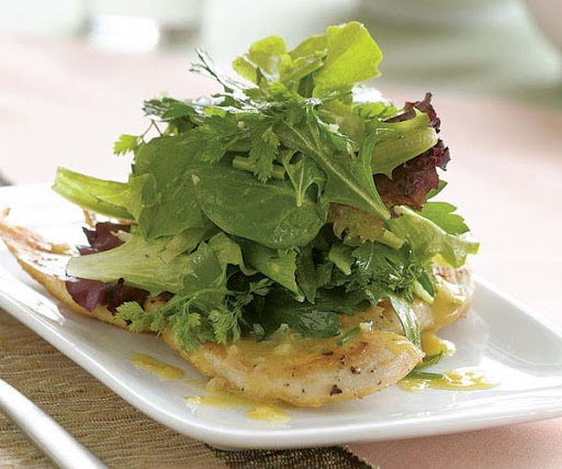 My husband and I tried this recipe tonight and it was EXCELLENT. We slightly breaded the chicken with flour, salt and pepper, which made the chicken nice and crispy. I have not added olive oil to the vinaigrette (if you like food that has character without adding any fat substance, try the vinaigrette without the olive oil). With respect to my herb mix, I used basil, flat leaf parsley, tarragon and cilantro. I added it to wild baby arugula that has a peppery taste that married nicely to our herb mix.