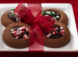 Spoon rounded 1/2 teaspoon filling into indentation in each cookie. Top with decors.