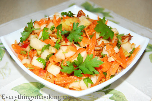 Vitamin salad with apples, carrot, walnuts and honey-lemon dressing.