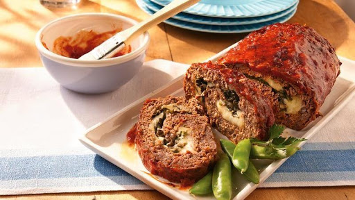2 On foil, pat mixture to12x8-inch rectangle. Sprinkle evenly with cheese; gently press into meat. Top with spinach. Starting at short end, roll up tightly, using foil to start roll and tucking in spinach leaves; seal ends. Place seam side down in ungreased 12x8-inch (2 quart) glass baking dish.
