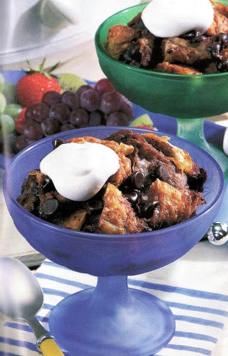 2. Grease a 1-quart casserole. Cut the croissants into 1-inch pieces and layer half in the casserole along with the chocolate chips, and half the egg mixture. (I use the crock pot insert.) Repeat layers with remaining croissants and egg mixture.