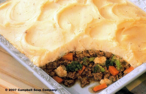 Stir the beef, 1/2 can soup, Worcestershire and vegetables in a 2-quart shallow baking dish.