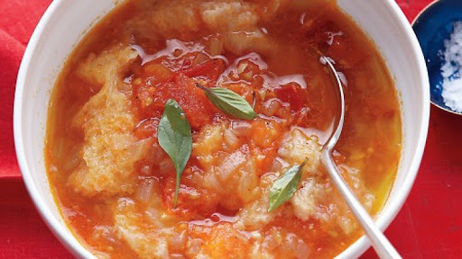 3. Finely chop tomato pulp by hand or in food processor. Add to pan. Bring to a simmer. Stir in bread. Cook, stirring, 5 minutes. Season with salt and pepper. Allow to stand, off heat, stirring from time to time, until room temperature, about 30 minutes. Fold in parsley and serve.
