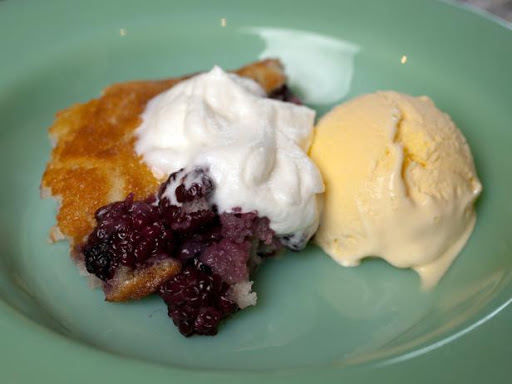 Rinse the blackberries and pat them dry. Pour the batter into the baking dish. Sprinkle the blackberries evenly over the top of the batter. Sprinkle 1/4 cup sugar over the blackberries. Bake until golden brown and bubbly, about 1 hour. When 10 minutes of the cooking time remains, sprinkle the remaining 2 tablespoons sugar over the top. Top with whipped cream or ice cream . . . or both!