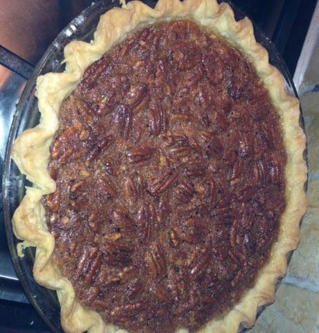 Combine sugar and corn syrup in a small saucepan: bring to a boil. Beat eggs at med. speed until blended. Gradually add hot mixture to eggs, beating constantly. Stir in butter, vanilla and pecans. Pour into pastry shell. Bake 350 for 40 min.