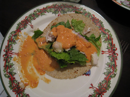 Serve fish to wrap in soft tortillas with lettuce, onions, hot peppers and sauce.