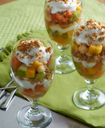 To assemble, layer 1/2 cup of fruit salad into the bottom of each parfait glass. Spoon 1/4 cup of yogurt over the fruit salad, and then sprinkle some of the granola over the yogurt.