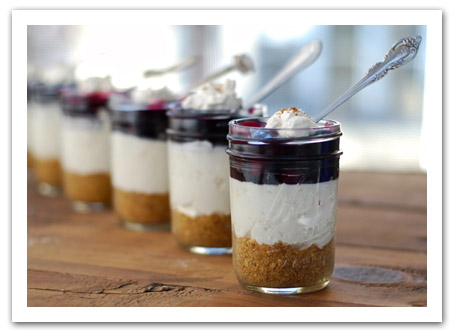 Place all of the cheesecake ingredients in the bowl of a counter top mixer. Whip until smooth and fluffy. Divide evenly among the 6 (half pint) jars… on top of the graham cracker crust layer.