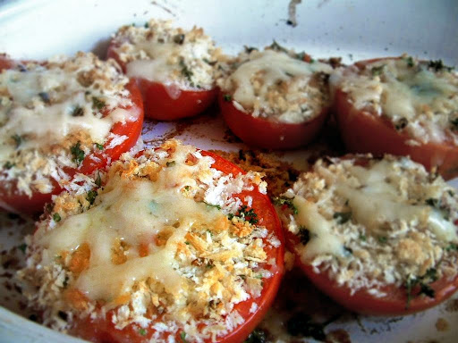 With your hands, fill the cavities and cover the tops of the tomatoes with the bread crumb mixture. Bake the tomatoes for 15 minutes, or until they're tender. Sprinkle with the cheese, drizzle with olive oil and bake for 30 seconds or more.
