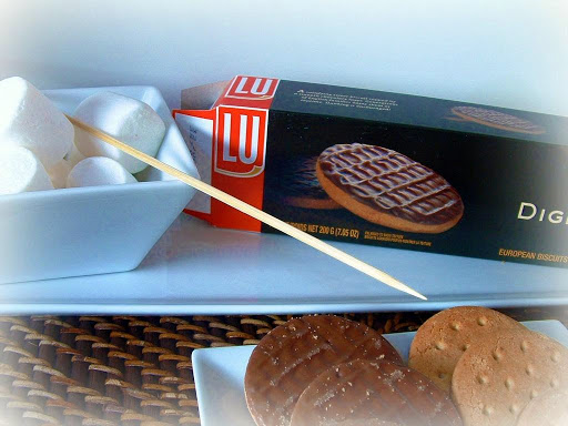 Over BBQ charcoals or a gas grill, melt the marshmallows and insert in between the two biscuits.
