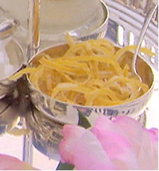 Using a vegetable peeler cut the yellow part of the lemon from the stem end down to the navel end, forming long 3/4 to 1-inch strips. Bring a heavy small saucepan of water to a boil. Add the peels and cook for 1 minute. Drain and then rinse the peels under cold water. Repeat cooking the peels, 2 more times, in the saucepan with fresh boiling water and rinsing under cold water.