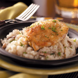 Place rice in an ungreased 13-in. x 9-in. baking dish. Sprinkle with onion and garlic; top with mushrooms. Dissolve bouillon in boiling water; pour over all. Place chicken on top.