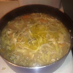 Roll the dough out on a well-greased board to 1/8 inch thickness. Use a pizza cutter or pie crust cutter to cut into strips about 1/2 inch wide and 3 inches long. Dust lightly with flour, and leave to dry for a few hours while the chicken cooks.