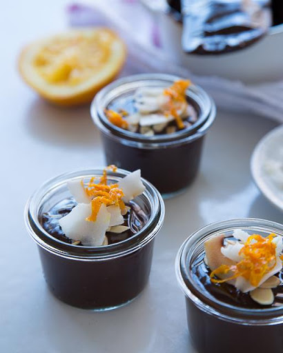 Orange Scented Chocolate Pots with Toasted Coconut & Almonds