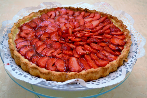 Fill the tart shell with the chilled pastry cream. Top with the sliced strawberries. You can arrange the strawberries in circles or in lines; it's up to you! Just make it look pretty. Sprinkle with powdered sugar just before serving.